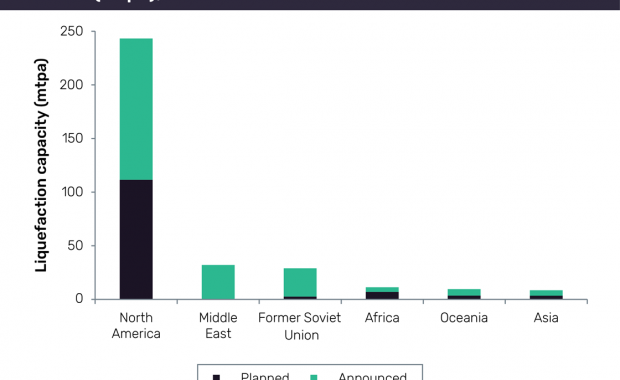 North America is expected to drive capacity growth in the global liquefied natural gas (LNG) industry from planned and new-build projects between 2019