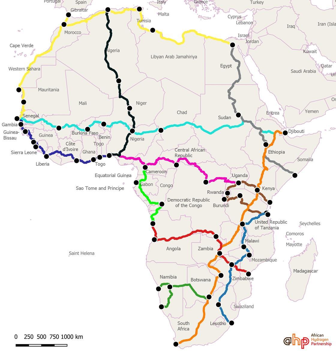 These trans-African hydrogen routes would connect major mining centres that use heavy-duty hydrogen vehicles (such as forklifts, tugs and bulldozers).