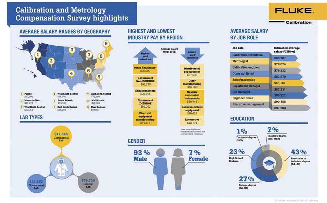 The data from the survey highlights median annual base salary information for multiple industries and disciplines in the fields of metrology, and how those incomes differ between educational backgrounds, industry, and more.